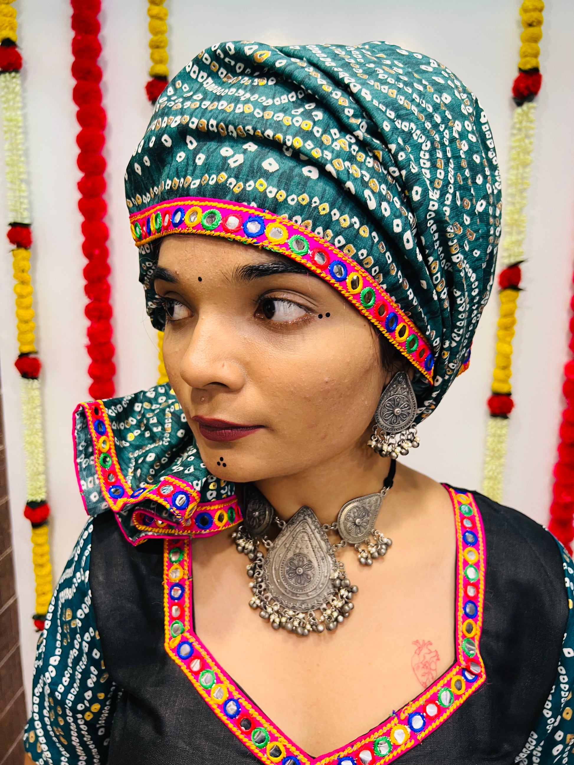 Dupatta: Green Bandhani with colorful Gamthi lace