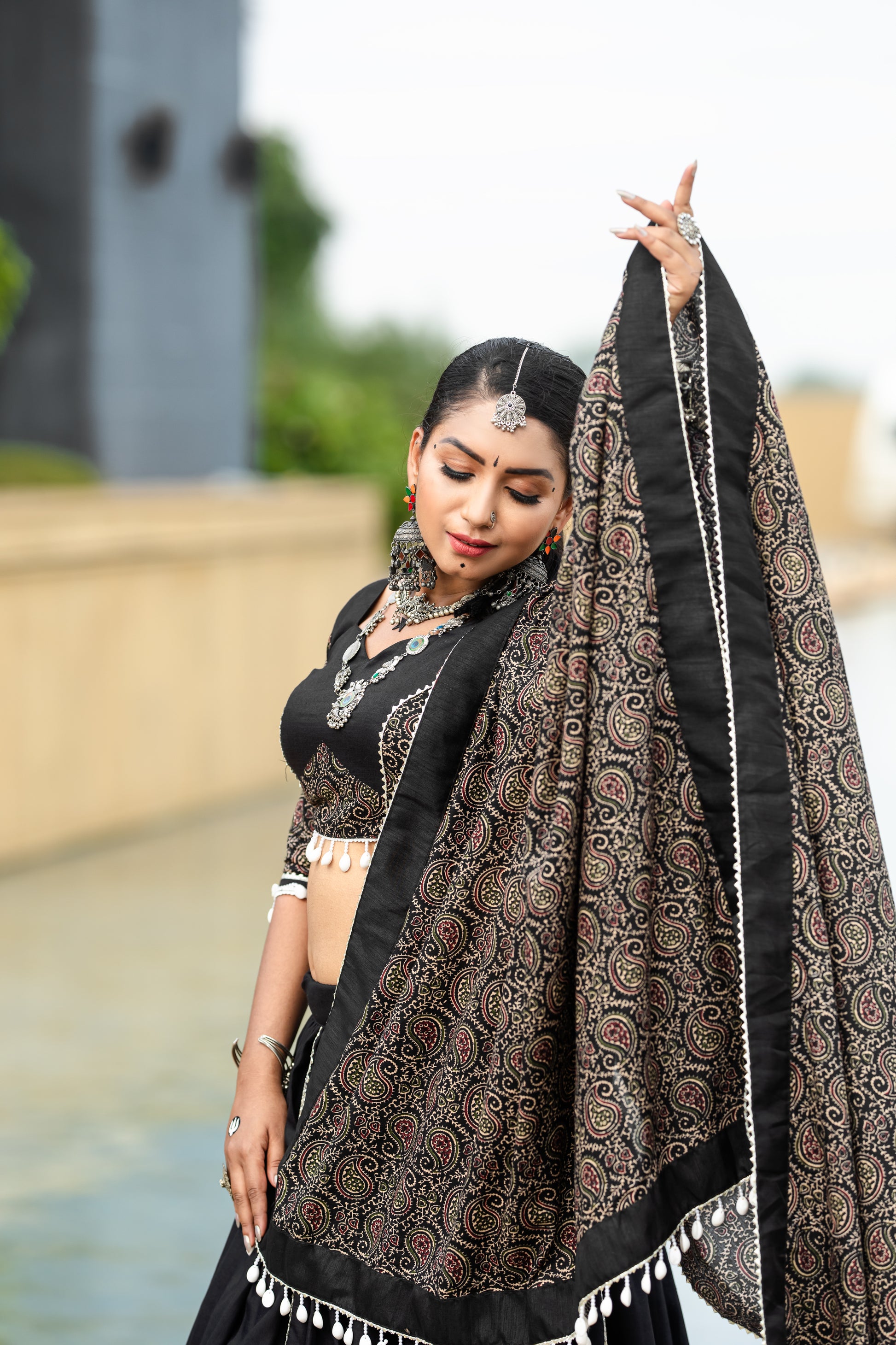 Crafted in premium cotton fabric, the lehenga features a classic black base with subtle white stitch paneling, creating a graceful flare for twirls during Garba nights. The blouse is highlighted with Ajrakh-inspired paisley print detailing, enhanced with latkan shell tassels on the hemline. A matching printed dupatta with paisley motifs and shell lace border completes the look, making it ideal for Navratri, Dandiya nights, cultural festivals, and wedding functions.