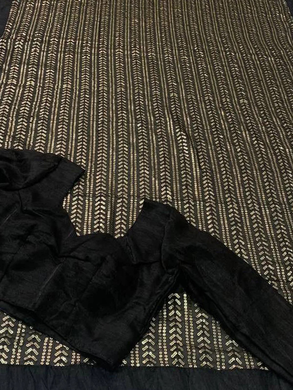 Step into sophistication with this stunning black wedding look saree, designed with premium sequence and thread embroidery for a bold yet elegant appeal. The shimmering black base makes it a versatile choice for weddings, receptions, festive evenings, and party wear. Paired with a 1-meter unstitched Art Silk blouse, it ensures comfort while keeping your style refined.