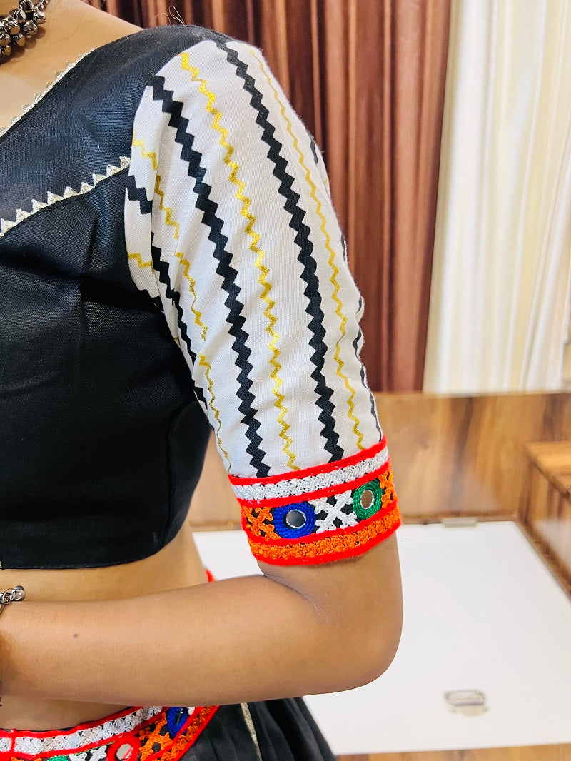 Blouse: Black with White Printed Sleeves & Red Gamthi Border