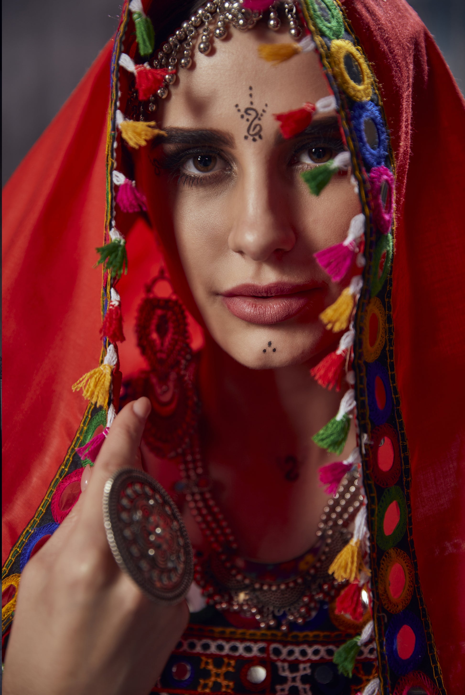 The semi-stitched umbrella-style lehenga comes with a flared 4-meter ghera, making it perfect for energetic garba and dandiya nights. The unstitched blouse is richly adorned with Aari & Gamthi work, giving you the flexibility to tailor it as per your fit.