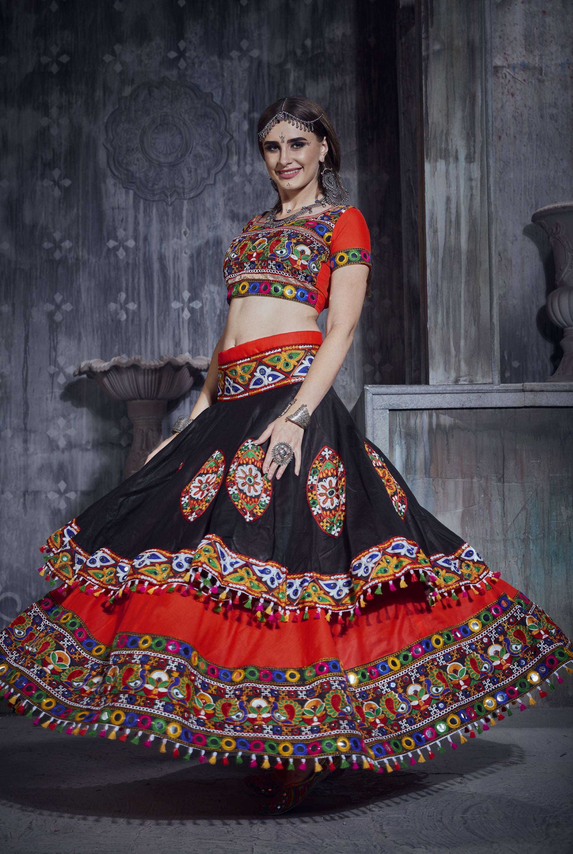 Step into the festive vibes with this vibrant Red & Black Navratri Chaniya Choli crafted for Garba, Dandiya, and traditional celebrations.