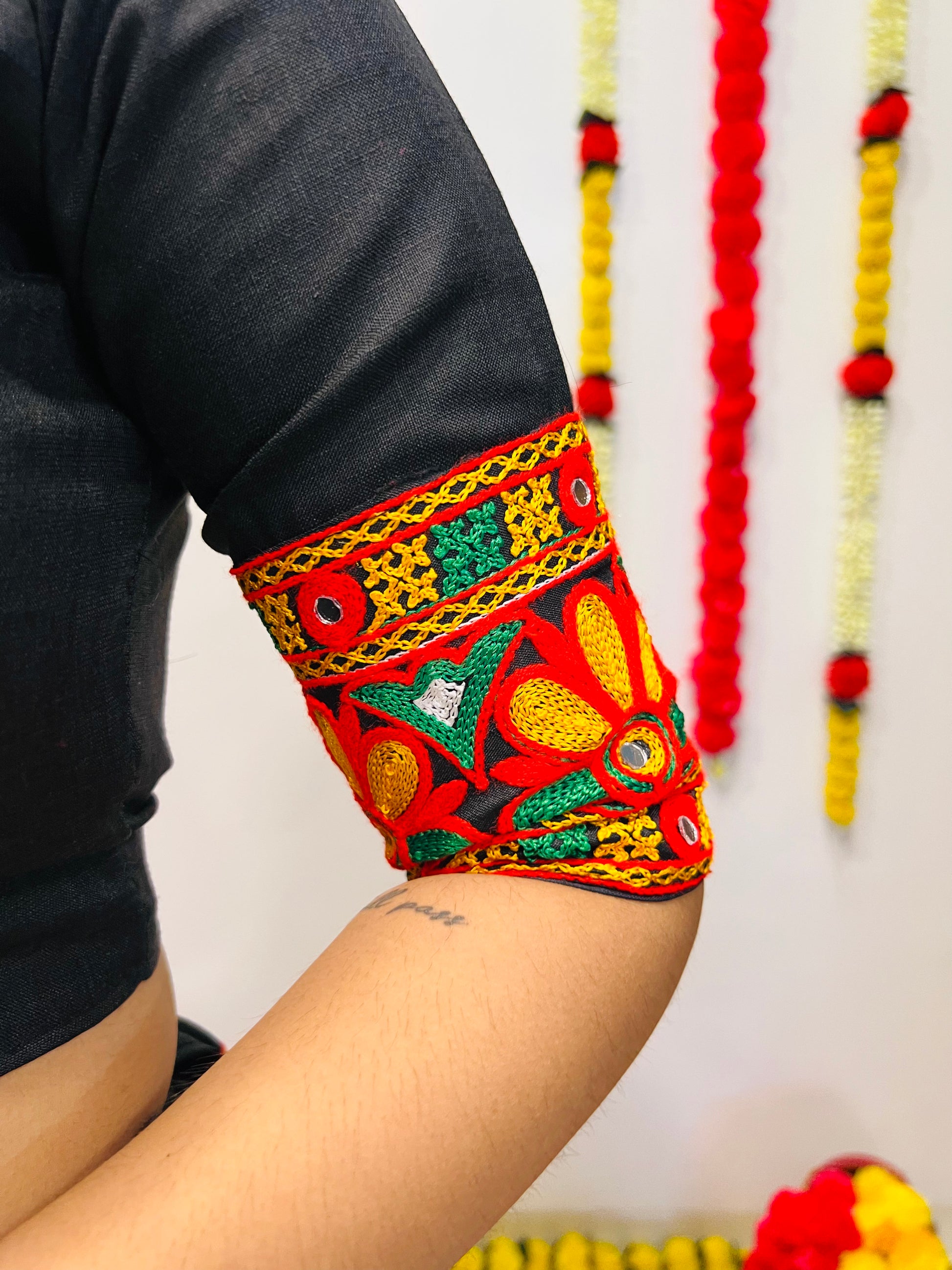 Blouse (Stitched): Black Art Silk with Embroidered Sleeves & Lace-up Back Design