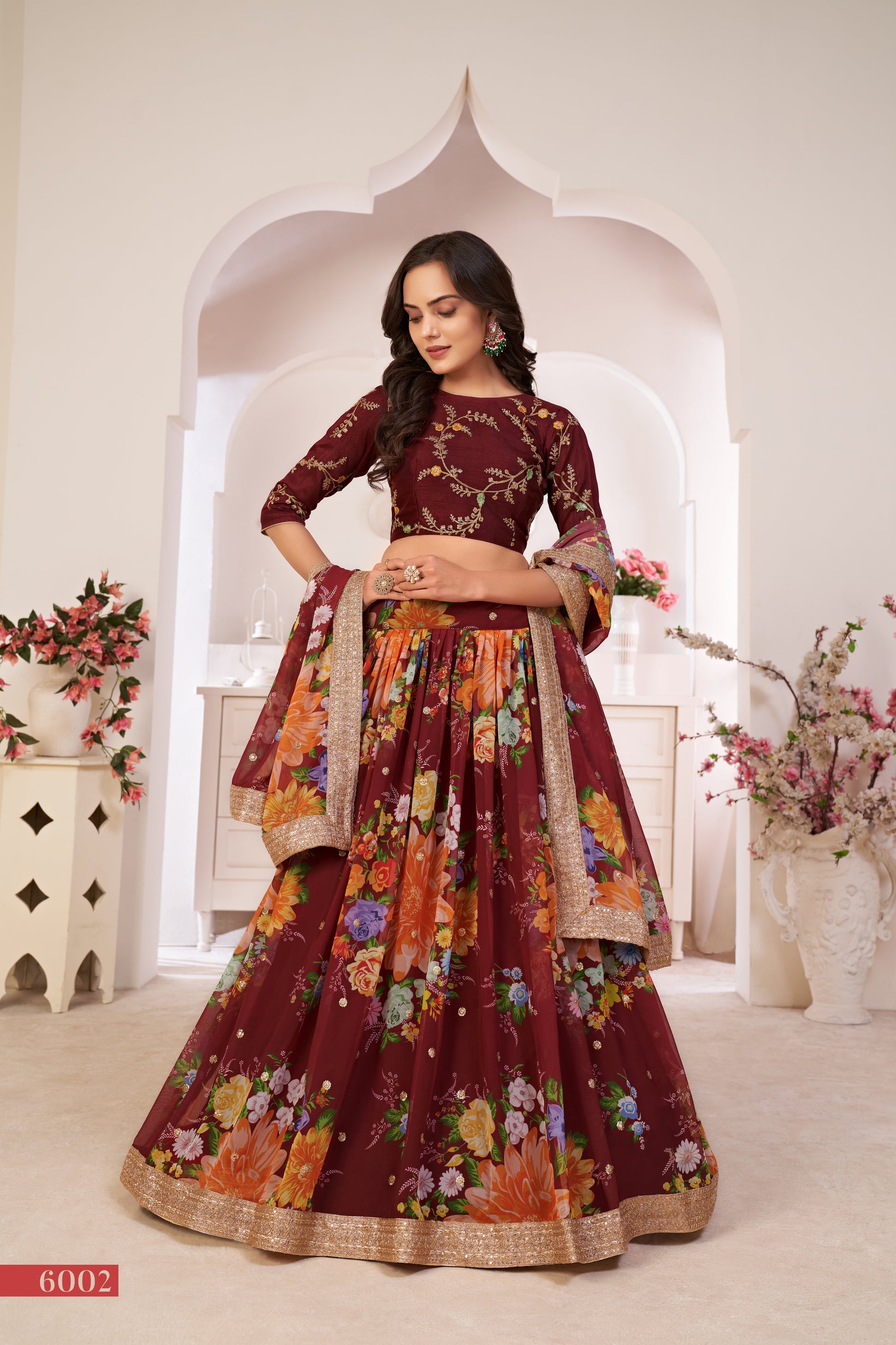 Make your wedding or festive look complete with this elegant lehenga choli. This exquisite ensemble features a semi-stitched lehenga crafted from flowy Georgette fabric in a rich maroon color. The lehenga is beautifully adorned with a vibrant digital floral print and embellished with sparkling sequins butti work all over. The border is intricately detailed with sequins and dori embroidery, creating a luxurious and textured finish.