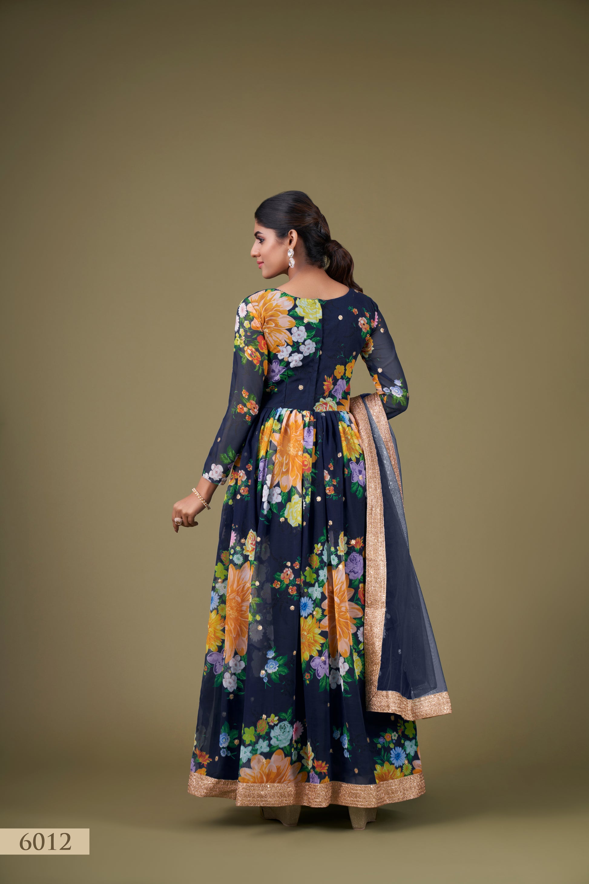 Make a statement in this stunning navy blue anarkali gown from the Premium collection. Crafted from high-quality Fox Georgette fabric, this gown drapes beautifully and is lightweight and comfortable. The deep navy background is illuminated by a vibrant digital floral print in shades of yellow, pink, and red. Subtle sequin work is scattered across the top and the full flair, adding a delicate sparkle that catches the light with every movement.