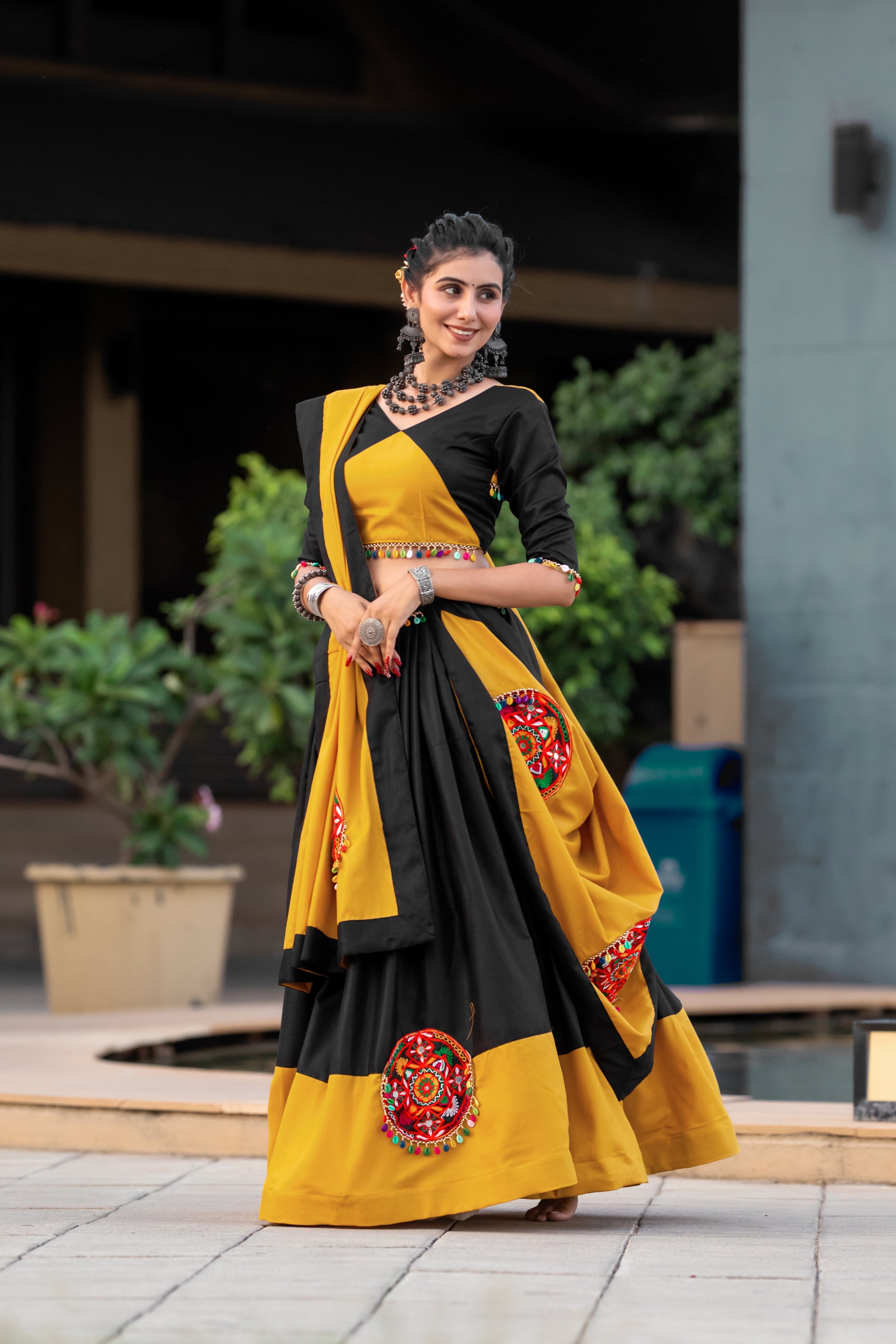Navratri Special Black & Mustard Yellow Chaniya Choli with Mirror & Gamthi Embroidery