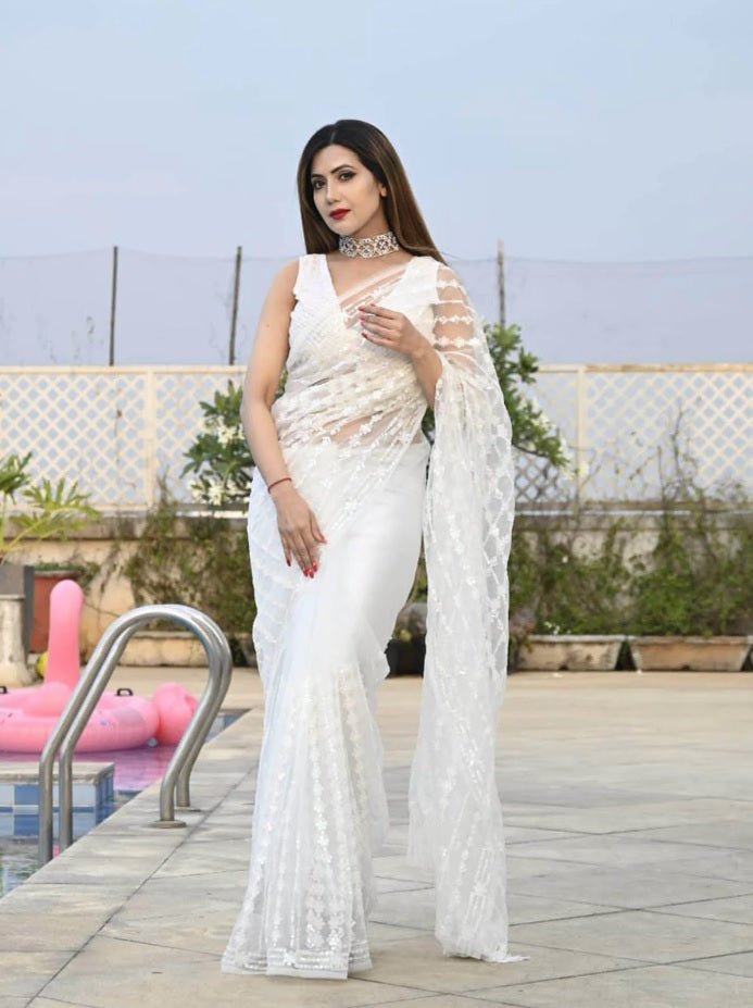 Available in two stunning shades—classic black and regal white—this saree comes with a matching soft net blouse (unstiched) featuring complementary sequin embellishment. The elegant fringe detail on the pallu adds an extra touch of drama and sophistication, making it an excellent choice for weddings, receptions, sangeet nights, or high-end parties.